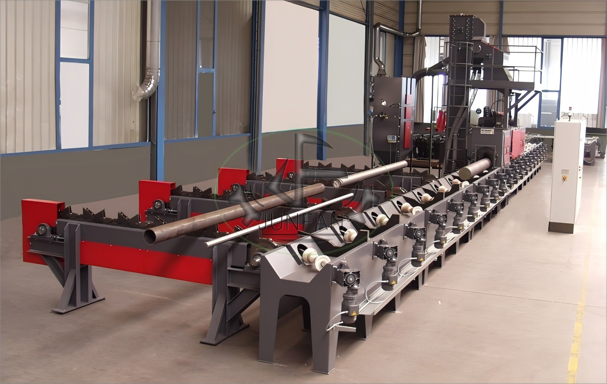 1:采用变频调速电机驱动辊道,钢管在辊道上旋转前进,确保外壁均匀受抛丸冲击。